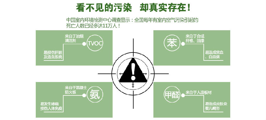 世界衛生組織公布的《世界衛生報告》指出,室內污染已成為人類健康的10大威脅之一。全世界每年更有280萬人直接或間接死于裝修污染,裝修污染已被列為公眾危害最大的五種環境問題之一。中國室內裝飾協會環境監測中心公布的數據表明,目前80%的白血病與室內污染有關。因裝修污染導致呼吸道患重大疾病的兒童每年有210萬人。