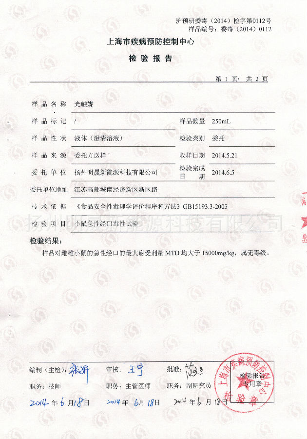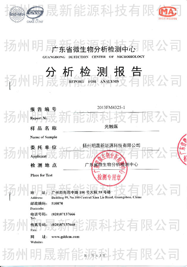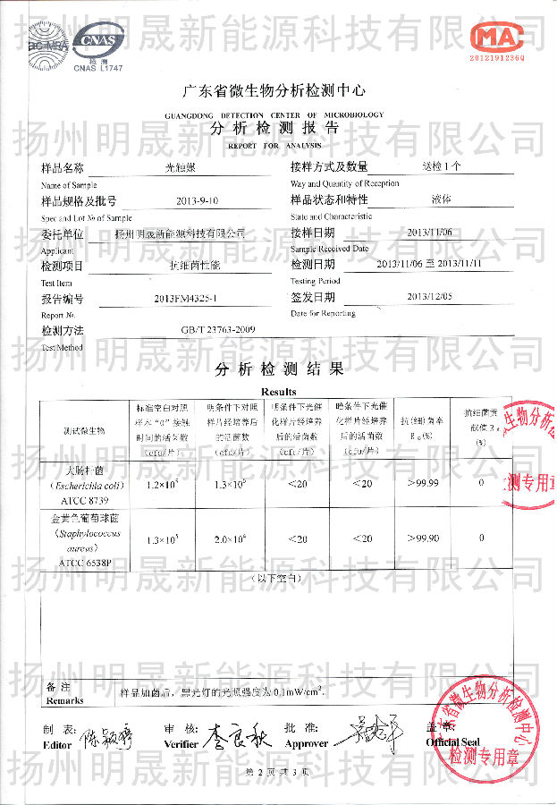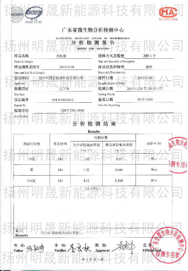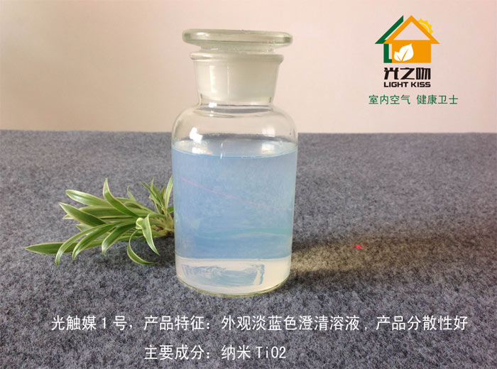 明晟光觸媒源自德國技術,為銳鈦型納米二氧化鈦水溶液,不含重金屬,無毒無害,外觀為澄清溶液,長時間靜置,不發生沉積現象,在室內光線或燈光下都具有優異的光催化效果,能分解在空氣中的有機化合物,對甲醛、苯系化合物及TVOC有極強的光分解活性,并抑制細菌生長和病毒的活性,有效殺滅多種細菌,平均抗菌率高達99.9%以上(日光燈照射測定數據),達到空氣凈化,殺菌,除臭,防霉。通過廣東省微生物分析檢測中心測試,在日光燈下,24小時甲醛的去化率為93.1%,苯的去化率為96.6%,TVOC的去化率為97.4%,對大腸桿菌抗菌率為99.99%,對金黃色葡萄球菌抗菌率為99.9%。